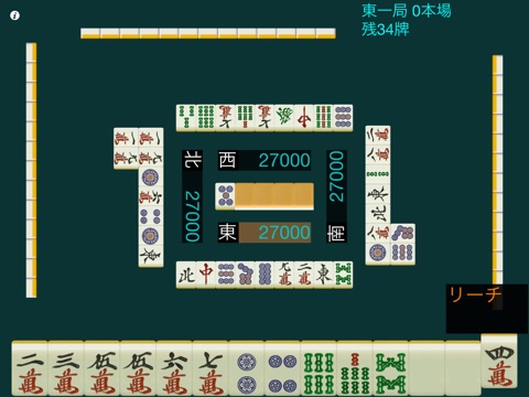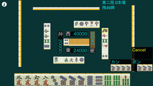 ■2012/9/22 途中セーブのご要望ですが、本アプリは自動セーブ方式ですので、ホームボタンを押してアプリを中断し、タイトル画面で[続きから]ボタンを押してゲームを再開できます。 ■2010/8/24 スピードが遅く感じる方は、画面左上のiボタンを押してスピードのスライダーを一番右側に設定して見て下さい。 ■2010/8/20 iPadの解像度(HD)に対応いたしました。 また、進行スピードの調整機能をつけました。画面左上のiボタンから設定が可能です。 ■2009/12/23 リーチが可能なときに右側に「リーチ」ボタンが出てきますので、それをタップして捨牌するとリーチが掛かります。「リーチ無」ボタンをタップすると解除可能です。 ■特徴 ・画面を横画面でシンプルにし、牌を出来るだけ大きくして見易さに配慮しました。 ■メニュー ・「練習対局」は「対局データ」に反映されない、半荘のみのプレイとなります。 ・「通常対局」は「対局データ」にデータが記録されていきます。 ・「対局データ」では平均順位や和了率、全役の和了った回数など83種の統計データを見ることができます。 ・「通常対局」では2位以内に入ることで半荘を連続して対局でき、累積点数がハイスコアとして記録されます。 ・「続きから」はアプリを途中で終了させた場合に、前回の続きからプレイすることができます。 ■操作説明 ・[牌の切り方]切りたい牌をタッチすると少し上に上がります。その状態で再度その牌をタッチすると牌が切られます。 ・[牌の鳴き方]牌の組み合わせを含めて、全ての鳴き方の候補が表示されますので、そのボタンをタッチして下さい。 ・[その他の進行]流局時など、画面が停止しているときは画面の任意の場所をタッチすることで次の画面に移行します。