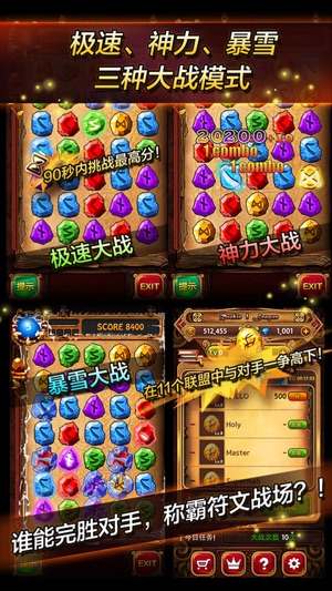 世界上最费脑力的消除游戏,符文大师! 受全世界500万玩家追捧的符文大师携全新的魔法再次登场,乐趣UP!UP!UP! 现在快抛弃那些无趣的小消除游戏来符文大师II挑战下头脑的极限吧! *符文大师II的特征 在古代北欧,最厉害的魔法师们创造了充满自然力量的符文文字。 使用符文文字的强大魔法只在选定的魔法师间流传… 许多魔法师为了获得从符文文字中得到力量的强大魔法开始学习符文魔法。 这些魔法师为了获得符文文字的力量学习符文魔法,他们中最强大的魔法师被称为‘符文大师’。 壮大你的魔灵石,打退所有对手魔法师,成为最强大的符文大师吧! 新魔法: 新增符文魔法, 双重消除魔法, 连击魔法,更具战…