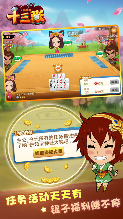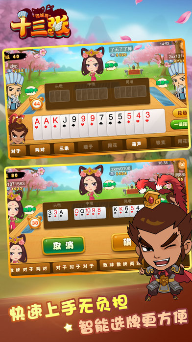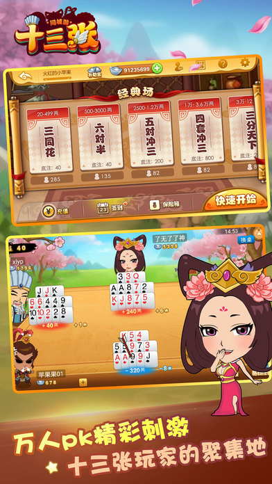 独具匠心的游戏设定,简单、方便、快捷的游戏体验,2017最新版十三张游戏强势来袭。新刺激、新体验、新感觉,多样化的游戏功能给您在枯燥的生活中注入新的活力。十三张,盛行于华东、华南一带的牌类游戏。无论您是否在现实中体验过十三张游戏的新手,还是熟练的十三张高手,当您接触过这款产品都会找到适合您的牌桌尽情游戏,赶紧畅快享受一回吧! --------------------------游戏特色-------------------------------- 【精美画面,挑战三国名将】 精细的人物刻画,精美的界面设计,尽享指上激情! 三国名将与你比拼牌技,精妙摆牌,运筹帷幄! 【单机/联网双模式】 没网络?不用愁!练习场让您0流量随意畅玩! 玩上几盘,减压舒缓心情,心情好,一切顺! 【火爆人气,福利多多】 福利天天送,还有活动奖励,边玩边拿,让你赢得更爽! 公平的游戏环境,人气爆棚,赶紧下载感受胜利的快乐吧!