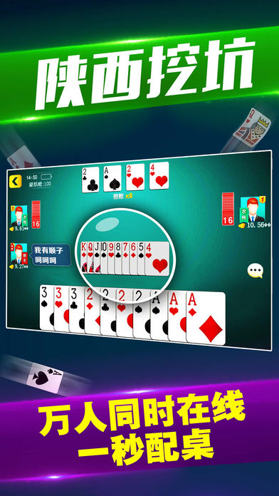 微乐陕西棋牌,随时随地喊上亲友玩一场; 游戏特色: 1、陕西麻将,陕西挖坑,陕西三代,跑得快等陕西地方特色棋牌9合一,一次下载,畅玩多款. 2、下炮子,放胡,大对子,豪华七小对等正宗陕西麻将玩法. 3、陕西挖坑,让你体会和斗地主不一样的刺激. 4、斗地主比赛,免费参加,随到随比. 5、全程防作弊.