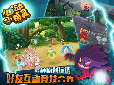 心动小精灵一款可爱的3D回合RPG。 1.丰富多彩的游戏场景 --上天入地,从天空竞技场,天空遗迹,到包含12个风格各异的巨龙大陆,到地底的试炼洞窟,废弃矿洞,以及深海大漩涡。 --变化多端,昼夜变化,天气系统,以及随机出现的浮岛,赌船,大鱼。皆让这个世界充满活力。 2.层出不穷的收集元素 --精灵收集:水,火,草,冰,土,毒!六种属性形态各异的小精灵,多达300多种的收集乐趣。 --符文收集:多种特性的符文套装供玩家收集。 3.千变万化的精灵养成 --精灵吞噬,进化,强化,升代,觉醒,甚至通过交配可以随机获得独一无二的精灵特性。 --千万可能的符文属性强化升级。 4.多样模式的游戏玩法 --丰富的PVE玩法,征服巨龙大陆,天空遗迹挑战,探索试炼洞窟。 --多层次的互动玩法,从好友互动送果,偷金币,到陌生人抢夺金币,奖杯;正式的竞技场PVP;随机的废弃矿洞争夺战;死磕的金币掠夺。 5.充满乐趣的策略流战斗 --手动战斗,或者自动战斗+集火皆可。还有独创支援系统。 --每个精灵都有独特的特性,极大改变战斗的玩法。