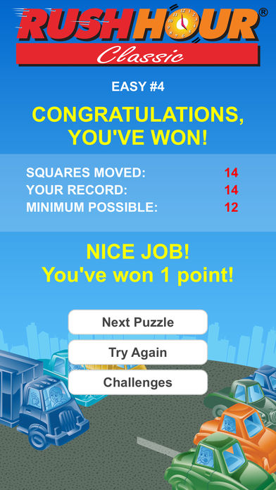 This is the original sliding block Traffic Jam puzzle, brought to you by the company who created it – ThinkFun. This Rush Hour game comes with a whopping 2500 challenges, ranging from Beginner to high Expert. It's a brilliant range of challenges, if we do say so ourselves… you're going to have a lot of fun on your iPhone with Rush Hour! This is the ORIGINAL Rush Hour – and it’s also the BEST. ************************************************** HOW TO PLAY: Your goal is to get the Red Car out the Exit Gate. To accomplish, just move the blocking Cars and Trucks out of the way. At ThinkFun, we believe in efficient driving. So for each challenge, we track your moves against the minimum distance possible, and score you on how close you came to a perfect distance score. Each challenge becomes a quest in itself! For your moments of frustration, we’ve included a HINT button. If you need a big boost, we also provide a SOLVE button. We recommend you fight your way through and never use these, but they’re nice to have available. ************************************************** GAME FEATURES: - 2500 Games, 625 at each difficulty level - Four difficulty levels – EASY, MEDIUM, HARD, EXPERT - Measures your score against your Personal Best and Perfect Score - Save multiple games in progress - Hint/Reset/Undo buttons to help you figure out each puzzle - Solve button to see how it’s done - Quick and easy Tutorial - Keeps history of Solved and Perfectly Solved challenges The Rush Hour app has won a 2010 Parents' Choice Gold Award for excellence in mobile play and a 2011 Editor's Choice Award from Children's Technology Review. If you like Rush Hour, check out Solitaire Chess and visit www.thinkfun.com to see more great games from ThinkFun!