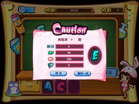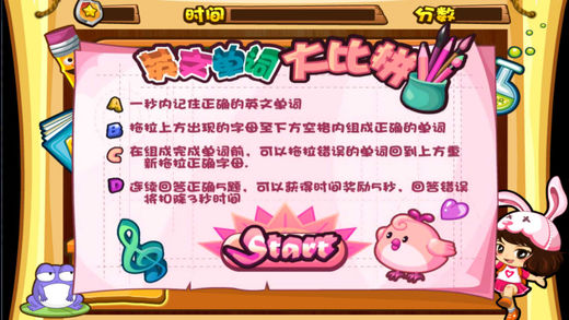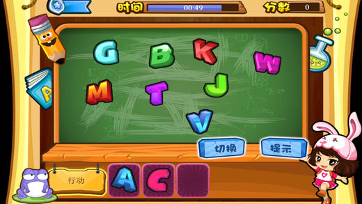 游戏玩法: A 一秒内记住正确的英文单词 B 拖拉上方出现的字母至下方空格内组成正确的单词 C 在组成完成单词前,可以拖拉错误的单词回到上方重新拖拉正确的字母 D 连续回答正确5题,可以获得时间奖励5秒,回答错误将扣除3秒时间