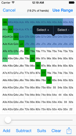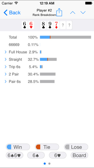 Poker odds taken to the next level... Hand ranges, hand rank stats, draw stats, equity heat charts, save hands, and more. Other apps can show odds of making a full house. This app can drill down deeper and see odds of each specific full house. Want to see breakdown of only the hands won? Now you can. Want to see breakdown of hands that use both hole cards? Now you can. Easy to use hand range editor and icons that look like mini-representations of hand ranges. Stats include equity percentages, win percentages, tie percentages, rank breakdown stats, draws breakdown stats, equity heat chart, and best overall hand stats. Main Features: 1. Calculates odds for up to 10 players. 2. Assign cards, random cards, or hand ranges. 3. Calculates equity %, win %, tie % 4. Calculate to: pre-flop, flop, turn, or river 5. Easily fold players 6. Dive down feature in hand rank, best hand, and draw stats to get more in depth data 7. Equity heat chart 8. Swipe to delete player. 9. 27 Built-In Hand Ranges 10. Create and store infinite number of Custom Hand Ranges 11. Save hands for future reference. 12. Twitter and Facebook Integration