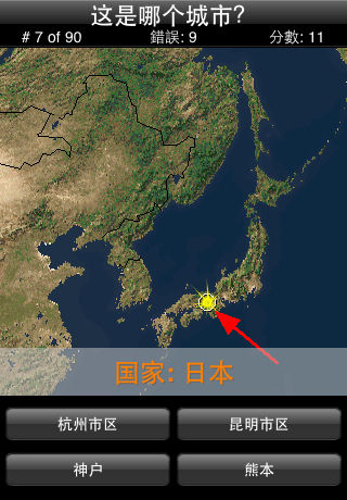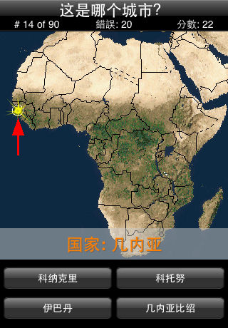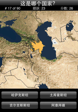 地理地图测验第1部分 is the Chinese localization of Geography Map Quiz Part1 game. This is is the first part of a geographical quiz which invites you to test your knowledge of countries, capitals and cities around the world. It may be used for testing and educational purposes for people well-informed about the map of the world. Game consists of 90 illustrated questions containing a fragment of geographical map. Questions are the following: - What country is this? - What city is this? - What capital is this? Each question has 4 possible answers. When you tap one of the answers, the default color of the pressed button is changed for a while to green (when it was the right answer) or to red (wrong answer). You have 3 attempts to give right answer. If you give it at the first attempt you will receive 3 points, at the second attempt - 2 points, at the third - 1 point. After 2 wrong answers to current question a hint will be shown to help you to give a right answer. Play the Geography Map Quiz now and find out how well you know your world!