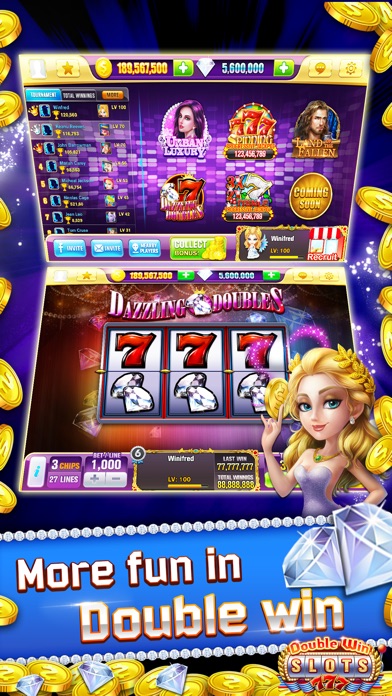 Download now! New players get 1,000,000 FREE BONUS CHIPS in the branding new FREE to play Casino app in the world! In addition to traditional slot machines, Double Win Slots also introduces a uniquely designed daily challenge which you won’t find anywhere else. You can win up to 400,000,000 chips by beating other players! Unlike other casino games in which only few top players win the BIG prize, every one can win such big volume of chips in Double Win Slots by beating only two players. You may think “Are you kidding me?” Yes, you have only two rivals, beat them and take the prize, try it now! Lovely assistants will help you in the daily challenge. While you play slot machines, your assistant will acquire experience. It will enter rage mode after level up, which will help you win the challenge greatly. TOP FEATURES: • Exciting daily challenges with huge payouts you won't find anywhere else! • Level up bonus is HUGE and increases constantly with your level! • Lovely assistants will help you beat other players and win the prize! • Daily FREE bonus could win you up to 30,000,000 FREE Chips just for logging in! • Challenge prize increases when you continue wins, it could be as HUGE as 400,000,000 chips! The game is intended for an adult audience and does not offer real money gambling or an opportunity to win real money or prizes. Any success in social casino gaming is not indicative of future success at real money gambling.