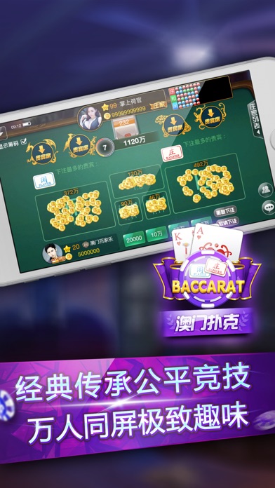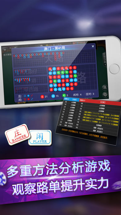 百家乐起源于法国贵族的一种纸牌游戏,流行于世界各地娱乐场。百家乐是世界上公认最文明最公平的一种娱乐项目。本游戏规则和澳门真实娱乐场完全一样,有澳门独创的五大路单(大路、大眼仔、小路、甲由路、珠路),还有创新的上庄玩法。 【人气超爆棚】 万人在线,牌局秒开,互动道具满屏飞,喇叭文字全天滚,种种现象凸显游戏人气超高,热闹非凡,值得一玩! 【品质超一流】 游戏环境运行稳定,用户服务周到贴心,再加上画质优美,布局精致,配音由顶级声优亲自上阵,视听享受妙到毫巅,可谓具备超一流品质游戏的所有优点,倘若错过,可悲可叹! 【玩牌超真实】 内嵌顶尖防作弊技术,支持追踪历史牌局,杜绝开挂,确保100%真人玩牌比拼,游戏环境公平公正,玩家所得有理有据! 【送币超疯狂】 系统庞大,内容丰富,敢于疯狂派送游戏币,注册送、签到送、盈利送、破产送、玩牌送、任务送、活动送、充值送,各种送,送到手软,送到各种类型玩家都叫好,所以,不管牌技叼不叼,不管经验老不老,倘若来玩,绝对能更嗨更快乐! 【奖品天天有】 不间断的人满即开赛、无门槛的限时赛,场场比赛送大奖,谁玩谁有机会。另外,今日玩牌榜、今日盈利榜、今日连胜榜、本周大师分榜、本周充值榜,个个排行有豪礼,谁争谁享实惠! 【特别声明】 在游戏《澳门百家乐》中,所有竞赛及抽奖活动与 Apple Inc. 无关,最终解释权归 澳门百家乐 所有。