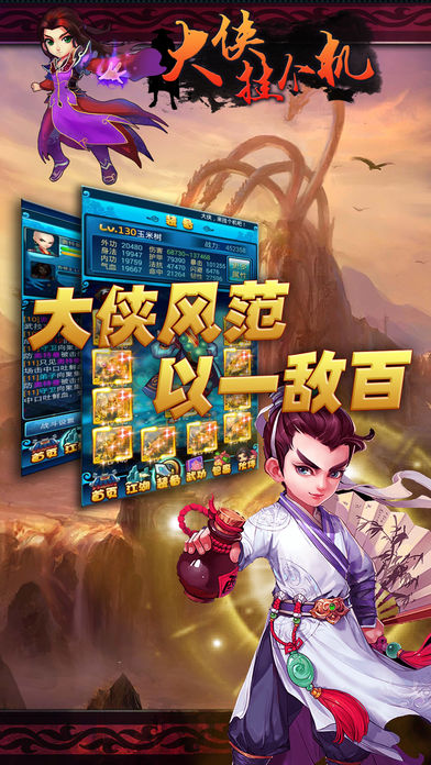 重度游戏太疲劳,轻度游戏又太无聊?那就来玩放置类手游吧!快来下载武侠风放置类手游《大侠挂个机》,绝对是放置类手游里的战斗机! 游戏介绍: 大侠挂个机是一款武侠题材的放置类手机游戏。游戏提供大量金庸笔下的经典场景供玩家探索,超过52个武侠剧情地图,总计超过500各式人物,完整描绘了整个武侠世界。玩家调整剧情地图可获得金币、经验和装备。 游戏特色: 三大职业任你挑 你可以挑选侠客、隐士、术士其中一个。侠客特色:武艺高强,擅长武力近战,身强力壮;隐士特色:施行武器伤害,擅长远程攻击,具有很强攻击及其躲避能力;术士特色:善用暗器伤人,擅长施毒飞镖,同时不易被暗器,毒气所伤。 花样装备等着你 游戏中为玩家在装备获取、洗炼、强化等功能点上带来无穷可能。玩家可通过剧情地图挑战、随机商城、打造、熔炼获得装备;通过消耗强化精铁,提升装备基础属性;也可以消耗金币对装备已有的属性进行数值上的重新分配。 玩法随时切换 游戏包括PVE和PVP玩法。PVE玩法中你可与伙伴一起挑战boss,获取丰厚奖励,也可定时挑战世界boss获得高额奖励。PVP玩法开设论剑系统,所有玩家以主角出战进行两两竞技,每次论剑还有排名奖励哦!PVP玩法还新增跨服战,全服玩家一起对战,嗨翻天。