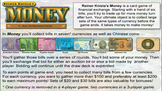Money is a fast-paced and addictive card game based on the original tabletop eurogame release by Reiner Knizia. "[O]f the iPhone card game apps we've played so far, Money is our hands down favorite."--Sebastian Blanco, TUAW You start the game with six bills of random currency. Your goal is to conc…