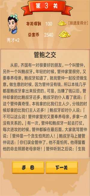 重大升级:由200关升级至500关,一次玩个够。自动跳转到下一个词条,刷题速度杠杠的。完全免费不需要购买任何金币就能通关。 成语是中国文化的历史沉淀。成语接龙作为古已有之的智慧型语言文字游戏,一直深受男女老少的喜爱。成语接龙闯关,经典游戏新玩法,绚丽动画特效根本停不下来。告别枯燥单调的接龙方式,一起体验花式成语接龙的魅力吧。 亡羊补牢,守株待兔,瞒天过海,翻山越岭……大中华成语博大精深,你所耳熟能详一定不在少数,你不知道的也很多。游戏从成语词典精选3000多个成语,一共500个逐步增加难度的关卡等你来挑战,同时穿插几百个富于历史知识和教育意义的成语故事。真正做到趣味盎然,寓教于乐,让童鞋们…