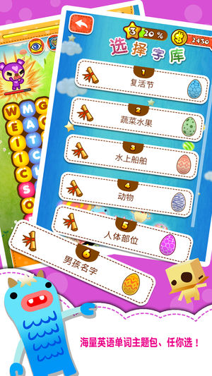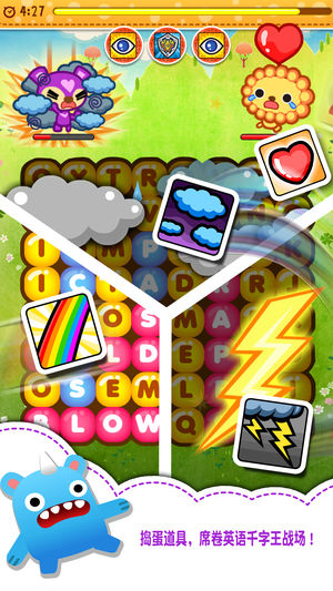 欢迎来到妖怪的世界,这款《妖怪来了》将让你打破以往对寻字游戏的刻板印象。喜欢玩找字游戏的玩家千万别错过,没玩过的赶快来试试,运用你的找字功力来驯服各种奇妙的妖怪吧! 玩家要尽可能快速的找到单字发动攻击,击败各种奇特的妖怪!若收集到妖怪徽章还可以把妖怪变成伙伴,进而强化玩家能力。 游戏玩起来简单又有趣,再加上一只只可爱又萌萌der妖怪,相信就算是不擅长英语寻字游戏的玩家也会爱上哦! 《妖怪来了》里面有丰富的英语单词主题、不同的关卡难度提供玩家挑战,让玩家在游戏情境中无形的反覆、迅速提升英语单词的熟悉程度。 游戏中充满各种神奇道具、以及超炫的武器装备,帮助你提升能力收服妖怪,还可以在…