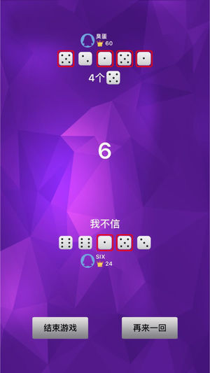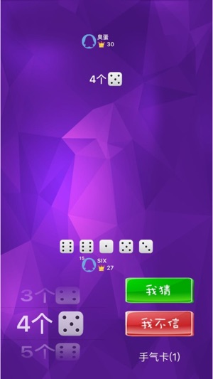 酒吧中比较流行的骰子吹牛游戏 游戏规则 1.两个人先摇盅掷好骰子 2.双方轮流吹牛,猜两个人共同拥有的点数(比如4个6) 3.第一个猜的个数必须大于1,也就是不能猜1个Y,至少猜2个Y 4.后猜的必须大于前一个,从小到大为,2个1 < 2个2 < ... < 2个6 < 3个1 < 3个2 < ... < 10个6 5.当你不相信对方猜的点数的时候就可以一起开盅, 如果大家实际手上的牌点数大于等于叫出的个数, 那么不信的人就输了;反之,不信的人就赢了(比如当对方猜4个6时我不信,那么如果两个人盅里的6的个数大于等于4,那么我就输了) 6.点数1在上述过程中都没有人猜过,那么在结算时就可以代…