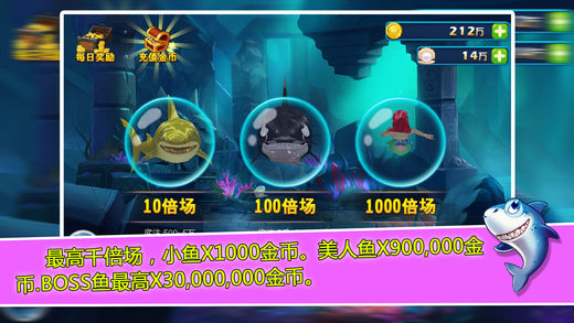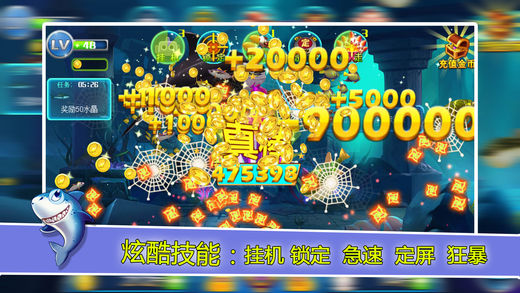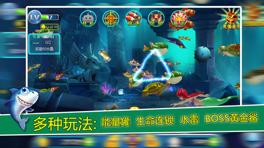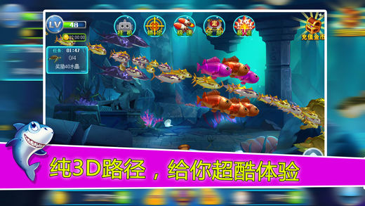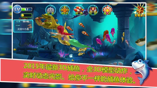2016年最新3D捕鱼,全3D模型,3D路径,3D鱼阵,实时动态光影。给你不一样的捕鱼体验。 游戏特色 【多种玩法】 ※能量罐:捕获到的鱼可以获得双倍奖励。 ※生命连锁:击中一条,全部捕获。 ※水雷:炸掉周围所有的鱼。 ※BOSS黄金鲨:击中一次奖励就翻一倍。 【酷炫技能】 ※挂机:捕鱼也能挂机了。 ※定屏:定住场景中所有的鱼,别让大鱼逃走。 ※急速:双倍设计速度。 ※锁定:越过其他鱼,直接攻击锁定目标。 ※狂暴:花费1个炮弹的钱,发射7枚炮弹,享受扫射的快感吧。 【超高奖励】 ※最高千倍场,小鱼也有1000金币奖励。 ※捕获美人鱼奖励900,000金币。 ※BOSS最终形态奖励高达30,000,000金币。