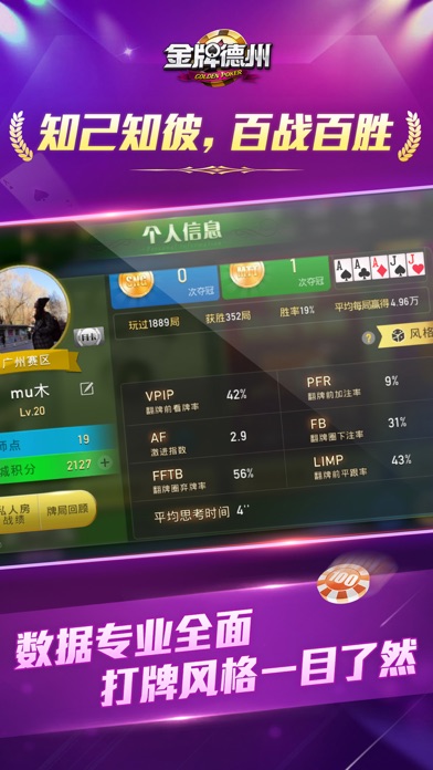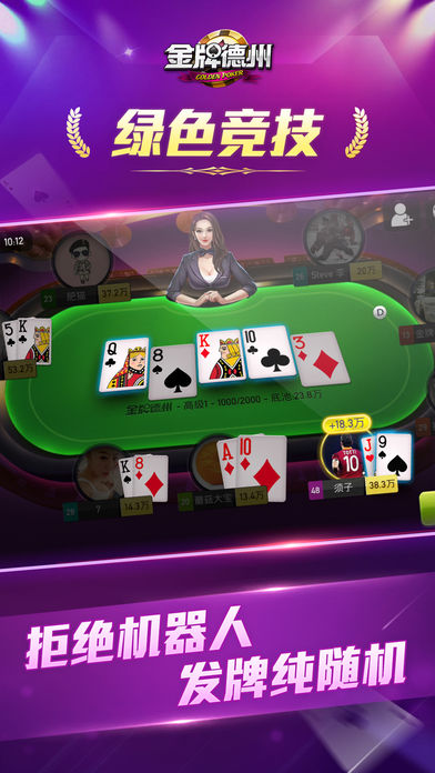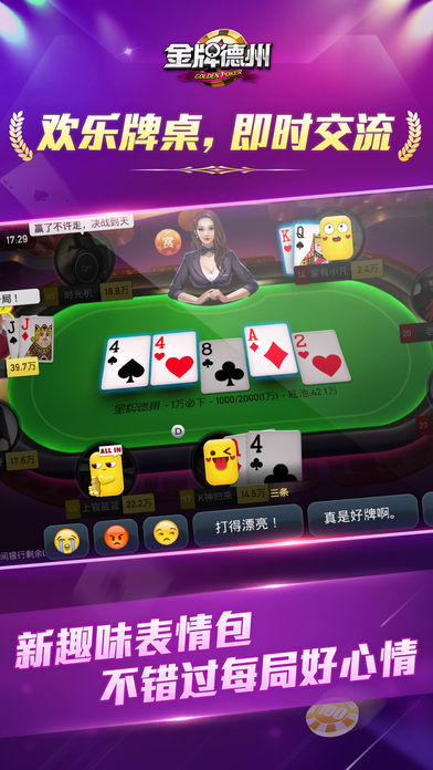 德州扑克比赛首选平台--金牌德州扑克,每晚9点免费赛! 丰富有趣的比赛玩法,全国七大赛区,同城竞技。 纯真人玩家,无机器人;发牌纯随机,无人为干预; 每晚九点半大奖赛,每月“金牌月赛”,奖品丰厚、与时俱进! GPT金牌德州扑克巡回赛,各路明星助阵,玩家集聚,尽受扑克盛宴。 全新战队系统,超多战队擂台赛、战队常规赛,擂主王座等你挑战! 每晚实力主播直播教学,深入解读每一牌局,助你提升德州扑克技术。 *专业比赛:赛制合理,奖品丰富,超高回报率! *专业平台:边打德州扑克边交流,欢乐牌局即时分享,社交游戏两不误。 *专业水准:玩家多数是来自德扑圈、IT圈、投资圈的德扑爱好者和大师牌手,和大师切磋德扑技巧,德州扑克爱好者的聚集地! 德州扑克是来自德克萨斯州的扑克玩法,全球最经典的扑克游戏。德州扑克在全球的受欢迎程度远高于麻将、炸金花、斗地主等热门棋牌游戏。 ======================================= 【游戏特色】 --横竖屏完美切换,高清画质,流畅的体验,3D引擎打造真实的比赛赛场画面; --精彩牌局一键分享,与朋友一起研究提升德州扑克技术; --高端用户群体,投资圈、金融圈、IT圈等高端人士都在玩; --强大的比赛系统,可与圈内朋友一起比赛; --即时牌局交流,快捷回复、语音、表情,满足你的社交需求; --丰富的赛程:每日免费赛、每晚大奖赛、实物奖品赢不停! --便捷的熟人约局:自建私人房,费用低,结算清晰;微信直接邀请好友入局,方便快捷。 ======================================= 来金牌德州扑克,每晚9点,免费参赛! ======================================= “金牌德州扑克”微信公众号:goldenpoker “金牌德州秘书”微信服务号:jpdzms 《金牌德州扑克》官网:http://goldenpoker.cn 客服电话:020-29864045