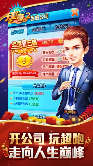 火爆2015年的商战模拟经营手游! 如有任何疑问,请联系我们客服QQ:800015374 您将扮演一个创业者,从风险投资到创办公司继而成为大富豪,问鼎福布斯排行榜。 超现实模拟经营,揭秘财富聚集和富豪诞生全过程。 股票、贸易、投资、员工、店铺、建筑、商会、官员等独创系统不断挑战您的经营才能。 这里是梦想的天堂,大富豪的摇篮,也是没有硝烟的战场。 养小秘,开豪车,千人羡慕。 创事业,铸成就,万人敬仰。 玩大富豪2,开启财富人生;成就富豪梦想!