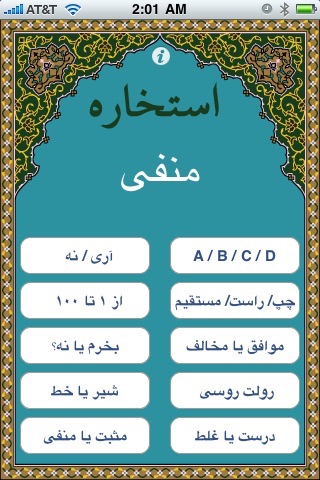 This application is a fun way to solve uncertainties in life. Just think of it as a super 8 ball which knows Farsi!! You have 10 different options to get the answers that you might find useful yet amusing. The answers are generated randomly. The word Estekhareh is an act of finding random events or text that could be used to come up answer for uncertainties in daly life.