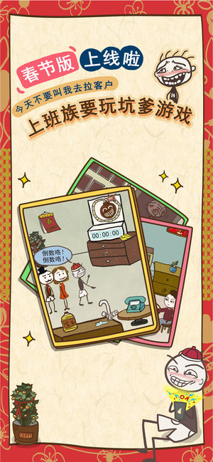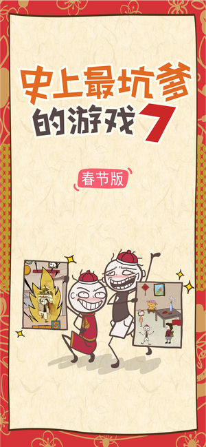 【获得荣誉】 曾获AppStore益智解密类游戏No.1; 曾排名AppStore中国区总榜前3,香港地区第1、台湾地区前5名; 曾被中央、广东、港澳台等数十家媒体采访报道; 【产品简介】 史小坑来拜年啦! 《史上最坑爹的游戏7》中除了 有传统“坑爹系列”的24个坑爹关卡外,还加入了各种接地气的新春元素,让玩家在游戏过程中充分体验到过年才有的各种搞笑趣事:抢红包、贴春联、放烟花……。 希望你们被坑了一圈之后,都还好好的,幸幸福福的过个好年!!在游戏中领略到生活的乐趣,在史小坑的世界里,你将享受到无尽的快乐! 像在除夕夜上的“倒数”与“春晚”都将成为火爆热点,现充们聚会一起倒数迎新年,单身狗…