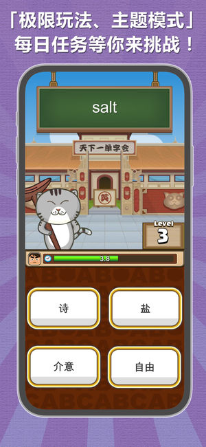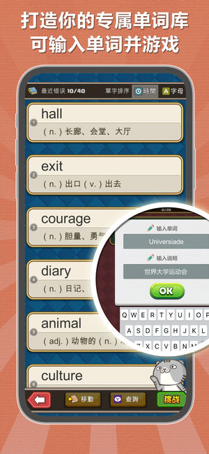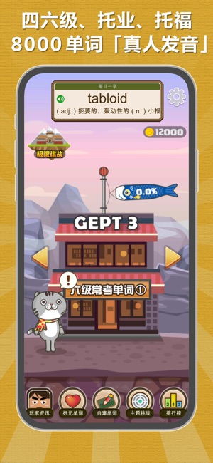 ◎ 4.5版新推出!新玩法、新功能,等你来挑战! ◎ 荣获「中华电信Hami App」软体开发大赏优选! ◎ 感谢巴哈姆特、电玩疯、魔方网、苹果日报、数位时代、重灌狂人、电獭少女等媒体报导推荐! 《 超级单词王》- 轻松学习英文单字的必备APP! ■ 学习结合游戏,记单词真有趣! ■ 趣味猫咪小助手一起闯关学单词! ■ 超过8000单词真人发音,学习标准发音! ■「问答、拼词、听力」多玩法设计! ■「自建词库」可创建自己的单词来学习或进行游戏! ■「标记词库」可将游戏中不熟的单词加入方便复习! ■「主题挑战」、「极限挑战」考验你的英文能力! ■「排行榜」与各地高手角逐名次,学习更有动力!…