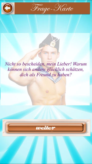Das niveauvolle, lustige Gay-Spiel: 150x Diskussionsstoff für schwule Männer Beispielfragen: ● Welchen Teil deines Körpers magst du am meisten? ● Was muss passieren, damit du 100% Spaß im Bett hast? ● Dein Date bittet dich, an seinem Zeh zu nuckeln. Und nun? ● Mal ehrlich: Was hältst du von offen…