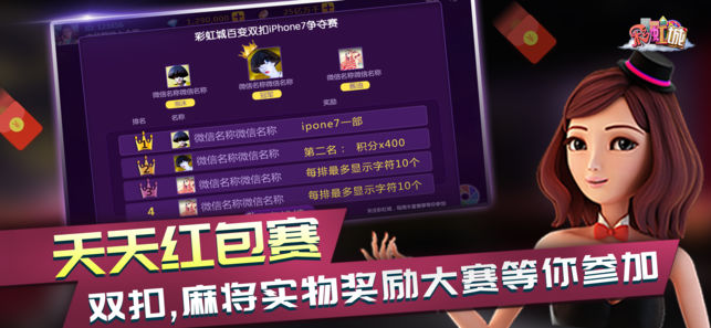 彩虹城温州麻将:拥有专业约棋牌游戏,致力于个提供给玩家一个全面体验+专业+分享的游戏平台。玩家自由创建房间设置规则,与显示好友约牌组局。玩家可以通过微信,直接邀请好友进入游戏房间一起游戏。同时,我们游戏拥有3D画质,让你有更与众不同的游戏体验。温州麻将,瑞安麻将,放炮麻将:地方特色麻将和传统麻将,地方玩法和传统玩发应有尽有。新增了地方语音。防作弊:可以让你看到牌局回放,在休闲娱乐之余,也能让你安心玩牌。牛牛,通比牛牛:拥有搓牌功能,给你一种真正用手在搓牌的刺激感。更有随机庄家,庄没牛轮庄,庄输轮庄,霸王庄,牌大坐庄等各式各样的玩法,总有一款适合您。相遇有时,后会无期,匠心打造,我们在彩虹城等待…