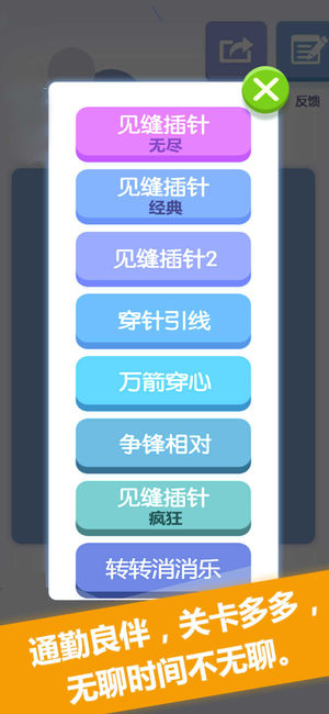 见缝插针里包含了八种模式,难度递增,八种模式都从不同程度训练你的手脑协调性。 无尽模式无穷无尽,看你能闯到哪一关; 经典模式500关等待你的攀登; 见缝插针2长长短短的障碍,等你挑战; 穿针引线模式不仅考验你的眼力,还激发了你的耐心; 万箭穿心更加刺激,真真是夹缝中求生存; 争锋相对让你领悟见缝插针的游戏真谛; 疯狂模式挑战你的极限; 转转消消乐还结合色彩辨认,更加刺激。 还有更多玩法,打发你的休闲时光。是否让你血脉喷张,蠢蠢欲动?别再观望啦,喊上你的小伙伴,一起下载体验!