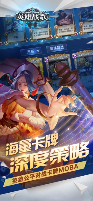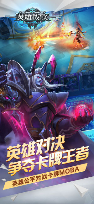 【游戏介绍】 《英雄战歌》是一款竞技卡牌手游,英雄公平对战卡牌MOBA。你将化身魔术师活跃在异次元世界,用卡牌召唤英雄,争夺最高荣耀!海量卡牌, 万千组合,没有最强的卡组,只有正确的选择!游戏简单易上手,策略丰富多样,战局分秒必争,决斗过程全程3D——相信你的卡牌,决斗者! 【游戏特点】 1) 简单易上手,玩法丰富多样 规则由浅入深,操作简单易用,7分钟一场决斗,每场变化多样,杜绝枯燥重复。多样的冒险、排位、大师模式让你体验更多的游戏精彩。 2) 海量卡牌,玩转深度策略 风、火、水、土、光、暗——六大系别,数百张卡牌,个性鲜明,互相克制。没有最强的卡组,只有万千变化的搭配和不断…
