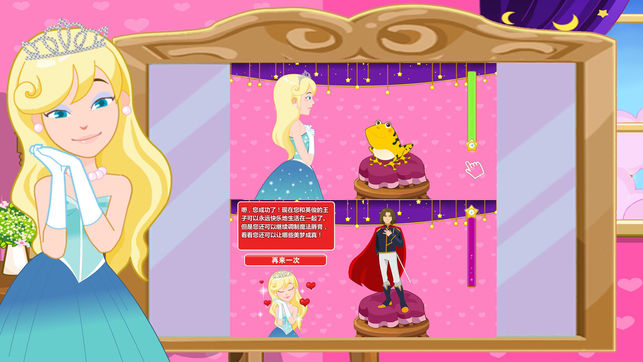 公主配唇彩吻青蛙第二部~~童话中,公主为了救她的青蛙王子,配了魔法药唇彩,然后去亲青蛙,就可以让青蛙变回王子...可是,魔法唇彩要怎么配呢?寻找完美的配方制成完美的唇彩得到最完美的王子!发挥你的魔力吧,配制出独一无二的魔力唇彩,变幻出你最钟爱的青蛙王子! 操作方法: 手指操作,选四种不同的配料放入瓶子中制作唇彩,涂抹唇彩时需要快速地左右移动手指,亲吻怪物前需要用手指连续点击怪物。亲吻后,就知道你所配置的唇彩能不能将怪物变成王子了!