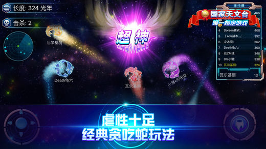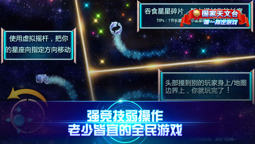 ***国家天文台唯一指定星座游戏*** 一款虐性十足、趣味性十足的多人互动游戏,借用经典“贪吃蛇”玩法衍生,简单易操作易上手,老幼适宜。玩家只需要操控你的星座通过不断吃各种光点,壮大自己,围杀其他星座,最终唯我独尊,成就一片星域。 游戏特色 【以小博大,战局随时都会逆袭】 你长你有理,我短我灵活!大星座不再有统治性的地位,小星座们更灵活,战局随时都有可能逆转! 【简单有趣,老少皆宜的全民游戏】 不管是什么年龄、什么性别、什么职业,只要简单的在屏幕上戳戳戳,就找到满满的乐趣! 【战斗技巧,老司机教你几招】 急速超车拦截星头、急停甩头抢道、180度华丽飘逸、画个圈圈诅咒你…这些都是战斗技巧! 谁说游戏只靠手速?策略也很重要,当然如果你恰好单身又练过手速 —— 完美! 【这个游戏有毒,根本停不下来】 次时代画风,一局一局像中毒了一样,根本停不下来,哈哈哈哈哈!——我由星座变为星域。 每日都有星座常识,找到和你匹配的星座,成为星座达人。 贪吃蛇大作战官方群:303430955 客服邮箱:kefu@taosecret.com