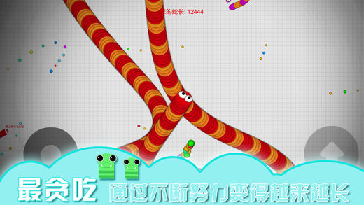 曾获得AppStore精品游戏推荐!(益智类) 玩腻了《球球大作战》,来试试更好玩更Q萌的《贪吃蛇:真人大作战》吧!国外早已风靡的slither.io,现在有中文版本啦!以前是吃豆子的无尽模式,现在不仅可以吃豆子,更可以PK其他贪吃蛇,吃掉别人变得更粗更长!超Q超萌的画风,一局一局像中毒了一样,根本停不下来,哈哈哈哈哈! 《贪吃蛇:真人大作战》一款超好玩、超Q萌的休闲竞技游戏,不仅比拼手速,更考验你的策略!在贪吃蛇:真人大作战的世界中,每个人在初始都化身为一条小蛇,通过不断努力变得越来越长,最终成为最贪吃的贪吃蛇! 游戏特点: 【简单有趣,老少皆宜的游戏伙伴】 不管是什么年龄、什么性别、什么职业,只要简单的在屏幕上戳戳戳,就能在贪吃蛇实时联机对战找到满满的乐趣! 【以小博大,战局随时要逆袭】 大蛇不再有统治性的地位,小蛇们更灵活穿插战场更迅捷,战局随时都有可能逆转! 【战斗技巧,老司机教你几招】 急速超车拦截蛇头、急停甩头抢道、180度华丽变向、画个圈圈诅咒你……这些都是战斗技巧! 谁说贪吃蛇实时联机对战只靠手速?策略也很重要,当然如果你恰好单身又练过手速—— 完美! 【萌系画面,根本停不下来】 超Q超萌画风,一局一局像中毒了一样,根本停不下来,哈哈哈哈哈! 三、游戏玩法: 1.控制摇杆走位你的小蛇,吃掉地图上彩色的小光点,就会变长哦。 2.小心!蛇头碰到其他贪吃蛇就会死亡,并且产生大量小光点。 3.长按加速键,用巧妙的走位让蛇身被别人撞上,就可以吃掉他们啦。 四、战术盘点: 1、超车杀跟对方朝同一个方向前行,突然一个加速冲到对方蛇头前面,对方就会来不及刹车撞到你! 2、尾行杀尾行大蛇,等待对方失误变成尸体,然后迅速吃掉变长,你懂的…… 3、围杀如果你已经足够长了,就可以团团围住那些小蛇,让他们无处可藏,哈哈哈~~ 其实呢,没有战术就是最好的战术,让对方猜不透你的下一步动作,抓住机会一击必杀!