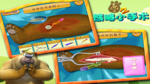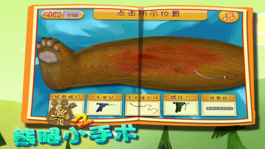 熊二参加森林运动会,在自行车比赛中不小心摔倒了,腿也摔断了,需要马上送到附近的医院进行腿部的手术,希望他能早日康复。游戏目标:根据提示,顺利的完成腿部小手术。