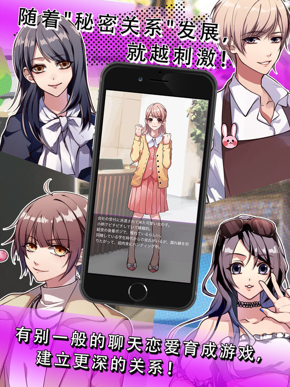 “秘密的关系...开始了” 虽然知道这种禁忌的恋爱不能实现…. 但是,日常生活中偶尔发生一些不能公开的秘密关系…..感觉应该还不错吧! 恋爱对象传来短讯也…..扑通扑通!把她/他们一举拿下! 游戏方法 1. 先输入你的名字,和选择角色性别。 2. 当你收到各个异性传来的短讯后尽快回复吧! 3. 好感度上升,你们2人的关系就更紧密…… 推荐给 -对禁忌之恋有兴趣的人 -觉得普通恋爱游戏不能满足的人 -对“禁断”没有抵抗力的人 -对现实中的男/女朋友不满的人 -喜欢使小聪明的人 -喜欢妄想的人 现在秘密关系支援日文,中文繁体,中文简体,英文四种语言,预设为日文,可于游戏中随时更改。