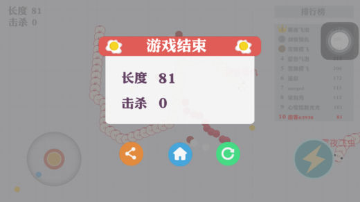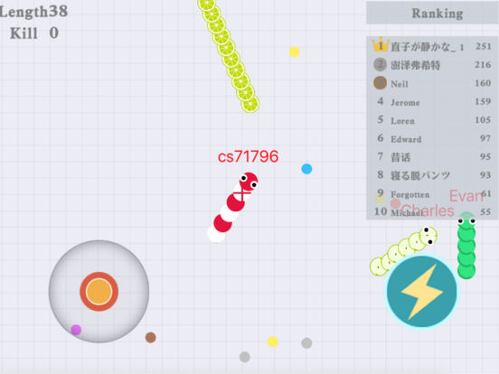 伙伴们,你们还记得小时候玩过的经典游戏贪吃蛇吗?现在已经完美的的化身为《蛇蛇大作战》啦~ (≧▽≦)/~,全新的游戏玩法等您来挑战哟! 这是一款超好玩的娱乐休闲竞技小游戏,在这款游戏里不仅是比拼手速,更考验您与众不同的策略!在贪吃蛇大作战的世界中,每个人在游戏最初的时候都是一条小小蛇喔,只有通过不断的努力才会把自己变得越来越长、越来越大,最终成长为贪吃榜排名第一的贪吃蛇喔O(∩_∩)O~ 游戏玩法 1.控制摇杆走位你的小蛇,吃掉地图上彩色的小圆点,或者攻击其他蛇蛇,要有技巧性的攻击,告诉你一个小秘密,合理使用加速按钮把其他蛇蛇围堵起来,被你围堵起来的蛇蛇无路可走撞上你的蛇蛇死掉后会掉出一堆食物哦~~~吃掉小圆点自己就会变长喔。 2.要注意!自己的蛇头碰到其他贪吃蛇的身体就会死亡喔,并且会产生大量小圆点。 3.长按加速键,用巧妙的走位让别的蛇蛇撞上自己的蛇身上,就可以吃掉他们啦。 最后祝伙伴们玩的开心,吃的开心,牙好胃口好,吃嘛嘛香O(∩_∩)O