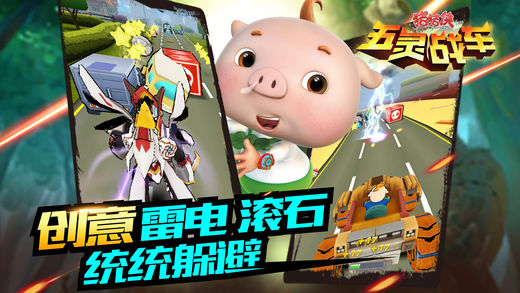 《猪猪侠五灵战车》是一款全新特色跑酷的赛车游戏。融合了猪猪侠动漫、兽形变身、卡片、跑酷、赛车等元素和玩法。画面上首创国内3D卡通渲染角色和赛车,设计精巧的关卡,刺激的BOSS战。 特色: 1、首创3D卡通渲染,环画式的角色和赛车视觉效果 2、全新兽形五灵卫,拥有超级合体,全技能五灵王 3、童话般关卡场景,岛屿、游乐园、鸟语花香的童话 4、多障碍创意玩法,雷电、滚石、统统躲避 5、惊险黑暗BOSS大战,发射火箭攻击黑暗乔伊飞船!