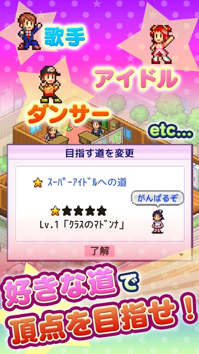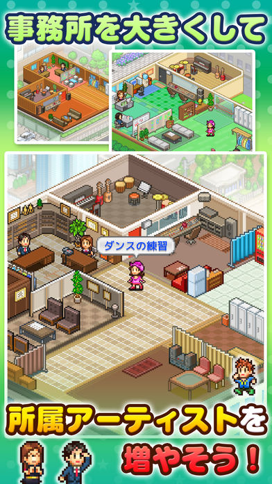 音楽事務所の社長に就任して歌手の卵を育てる、アイドル歌手育成シミュレーションゲーム ! 自分の足や広告媒体を使って、さまざまな個性を持った新人を発掘し雇い入れましょう。 まずは所属するレコード会社を決めるところからスタート。地道なレッスンを繰り返し、見事オーディションに受かることができれば念願の歌手デビューです。 デビュー後は各地のイベントでの営業活動、気持ちのこもったCD制作、ファンと触れ合うライブ開催を通じて、どんどん人気を上げていきましょう。人気が出れば、有名なお昼の番組にゲスト出演できちゃうかも!? ファンが増えれば、営業の依頼、CDやグッズの売上がうなぎのぼりに増えていきます 幅広いファン層を獲得して、各レコード会社が開催する音楽賞も狙っちゃいましょう!! それでは、最高峰の音楽賞「日本ミリオン大賞」を獲得するアイドルの育成を目標に、目指せミリオンヒット! -- ※ゲームデータは端末内に保存されます。アプリ削除、再インストール時、機種変更のデータ移行は未対応です。 他のゲームは「カイロソフト」で検索してね。 http://kairopark.jp 遊んだことがあるかもしれないような無料ゲームや売り切りアプリが盛りだくさん! 2Dドット絵のカイロソフトゲームシリーズだよ。 最新情報はツイッターをフォローしてね。 https://twitter.com/kairokun2010