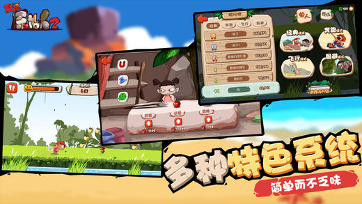 《聚逗原始人2》来喽!和小伙伴们一起踏上全新的冒险,完成全新的训练,新的征程现在就开始哦! 游戏人物不仅沿用1代人物“红毛”,同时“龙二”和“大暖”也加入其中,让训练和战斗更加有趣! “训练排行榜”,让训练不再单调,看看谁才是真正的训练之王! 全新“兽栏”系统,让野兽们不再是被击败的对象,更可以抓捕和饲养哦~让骑宠不再是梦想~!
