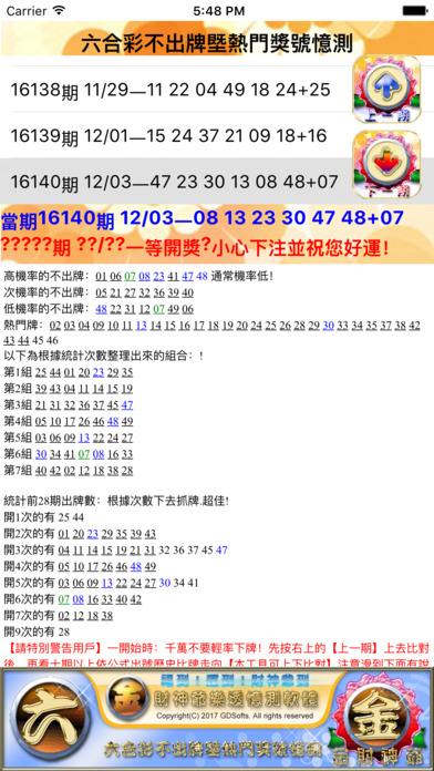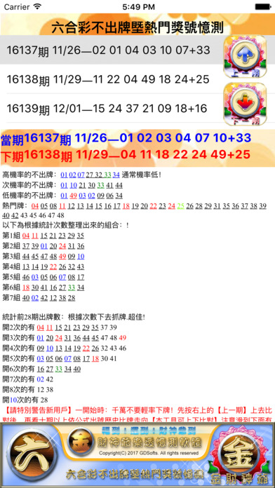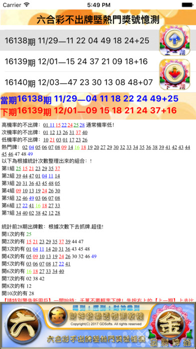 本軟體為隨開即可參考模式!自己可按【上一期】進行驗證。依經驗判斷僅供參考!。觀察中獎走向、中獎次數、中獎位置,再善加參考應用。依經驗!增加自己的經驗值祝君好運! 其中藍色為當期獎號,墨綠為特別號,一般都可以當不出牌也不一定。【小祕訣】!看到有藍色的組合時,可以左右數不用或藍色挑掉除不用】依經驗判斷僅供參考!自己可按【上一期】進行驗證。依經驗判斷僅供參考!。觀察中獎走向、中獎次數、中獎位置,再善加參考應用。依經驗!增加自己的經驗值祝君好運! 【請特別警告新用戶】一開始時:千萬不要輕率下牌!先按右上的【上一期】上去比對後,再看十期以上依公式出號歷史比牌走向【本工具可上下比對】注意滑到下面有說明,再來增加自己的抓牌經驗後,再自己選號。以免照成重大損失!見仁見智!