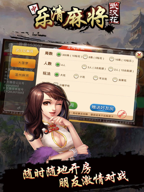微信邀牌友:不管朋友在哪,随时随地线上约战开房想玩就玩。 玩法太地道:地道的乐清武汉花(大花,小花,平方花)四人,三人,二人。 严格的防作弊:牌局回放录相,同一IP不能同桌。 真人实时对战玩法,陪伴您快乐每一天