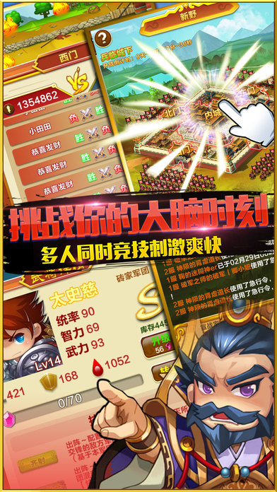 欢迎大家加入官方QQ群:374771657 回到三国做领主: 升级建筑、指派工人、打造装备、武装军团、寻访名将!你能想到的,《主公打天下》里都能拥有,平灭匪患、攻城掠地,征服其他玩家天天向您进贡!一键轻松征战、睡觉挂机生产、半价抢购军备、霸气调教历史名将,还有小婵妹妹天天陪你玩哦~ 【特色玩法】 1.掠地:挑战其他玩家,掠夺地盘和财富, 2.攻城:攻城是以家族为单位,当家族达到5级后,族长便可以选择一座城池作为目标,发动攻城战役,整个步骤分为宣战-出征-开战-决胜。 3.平匪:组织部队小试牛刀,消灭领地附近的山贼收缴物资,获得武将升级道具和金币赏金。 4.演武:与同等级领地的其他玩家进行无损失的模拟对战,逐渐熟悉士兵与武将的搭配。胜利后获得勋章,兑换高级武将、稀有道具。