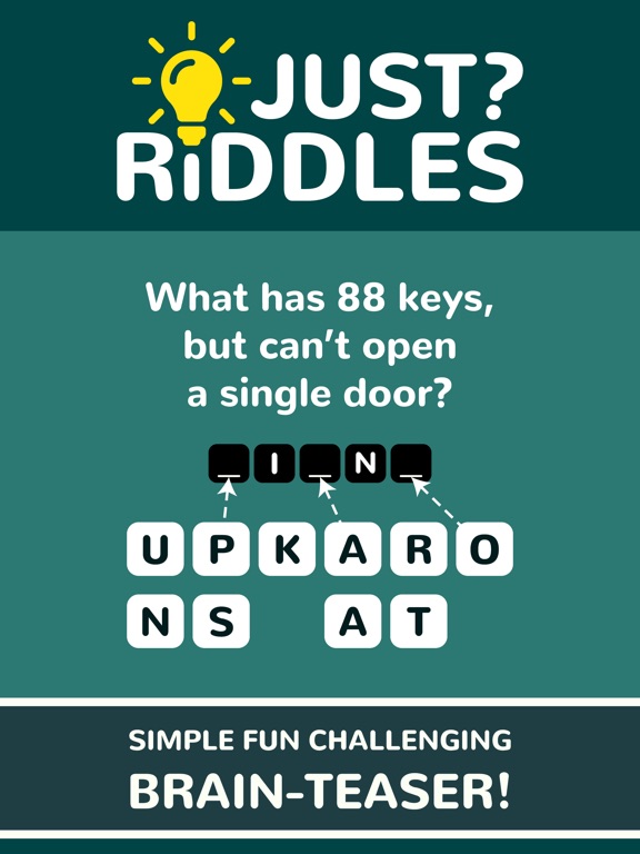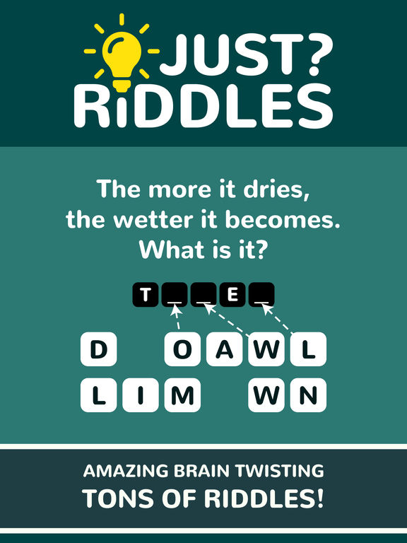 Free Fun Game! Addicting thinking word game! Each level is a fun riddle, can you guess the word? Tons of riddles to boost up your brain power! Some easy, some challenging! some rhymes, and some funny! ●PURE AND INSTANT FUN● No registration, no complicated rules. Just start playing, guess the word, and have fun! ●SIMPLE AND HIGHLY ADDICTIVE GAMEPLAY● Read the riddle and think; find out what word is the answer. Guess the word. Win! ●NO WIFI WORD GAME - OFFLINE● You can play Just Riddles word game offline anywhere anytime. No Internet is required! ●FAMILY FRIENDLY● Just Riddles is one of the best word games for kids. Help your kids to think from riddles. Have a great time together with these amazing riddles from Just Riddles! If you are a word game lover, you will find this game to be quick, easy, & a lot of fun! See if you can handle the addictive word challenge Just Riddles!