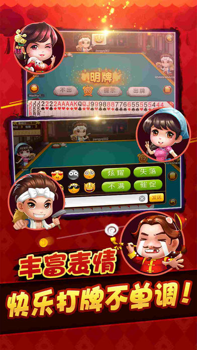 同城游新四人斗地主,全新升级啦!新增经典大众玩法,大家一起来斗地主吧!四人斗地主流行于江浙沪一带,游戏属于争先型牌类游戏,游戏由四位玩家组成,每局牌有一个玩家是“地主”,独自对抗另三个组成同盟的玩家,农民或者地主手中的牌先出完即可获胜。 同城游四人斗地主画面精美,操作流畅,流量节省,玩法经典,让您随时随地畅享棋牌乐趣。 【游戏特色】 1、新四人斗地主,经典规则震撼上线! 全新界面,全新体验!经典大众规则,地道苏南规则,都有哦,任你选!, 2、Q萌画风, 大家一起斗地主! Q萌人物角色,精致游戏画面,流畅斗地主就在这里啦! 3、丰富表情,快乐打牌不单调! 炫酷特效,逗趣聊天表情,打牌闲聊两不误,轻松娱乐! 4、签到任务,人品福利快来领! 连续签到有福利,每日任务有奖励,还有幸运大转盘抽奖等你来呦! 5、真人对战,智能托管轻松玩! 一秒开局,无需等待!智能托管,真人实力对战,比拼牌技的舞台!
