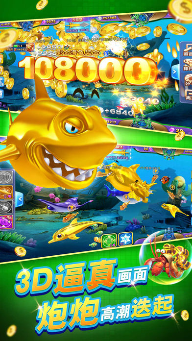 大鱼多!爆率高!赢分快! 诚信安全!完全杜绝骗分情况! 闪电升级炮倍!一天内升级到千倍炮! 爽快感满点!完全还原街机捕鱼体验! 游戏特色 1、采用真3D技术,画面更为精致细腻,相信捕鱼游戏的达人们都能在游戏中找到街机玩法的经典回忆! 2、小鱼钻石爆率超高,大鱼和BOSS更好杀,获取钻石升级炮台,人人都可升至10000倍炮! 3、击杀彩金鱼累计可摇奖,多种福利玩的爽,高倍率出金币,享受皇室至尊捕鱼乐趣!