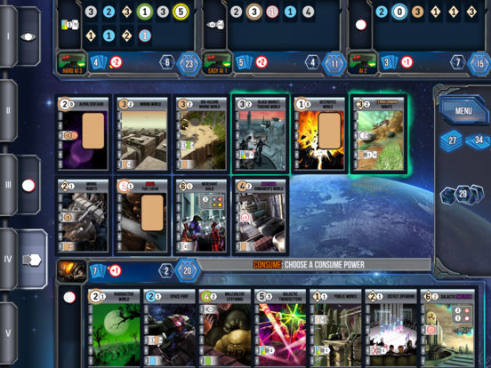 Race for the Galaxy is a strategy boardgame where players advance their empire by playing cards to build technological developments or to settle planets. Its core mechanic is a phase choosing game. Players secretly and simultaneously determine which one of seven phases they will lock in, all reveal at once, then execute the phases in order. Will you build an engine to ramp up VP generation on cheapo production planets? Will you invest in exploration and settle rare and valuable VP rich planets? Or will you rush a military conquest to cut off your opponents before they have a chance to develop their strategy? Game Features ▪ 2 – 4 player with network multiplayer ▪ Single player mode with advanced neural network AI ▪ Five starting worlds and ninety settlement and development cards ▪ Free promo pack included: New Worlds with six additional starting planets ▪ Gathering Storm and Rebel Vs. Imperium expansions available immediately
