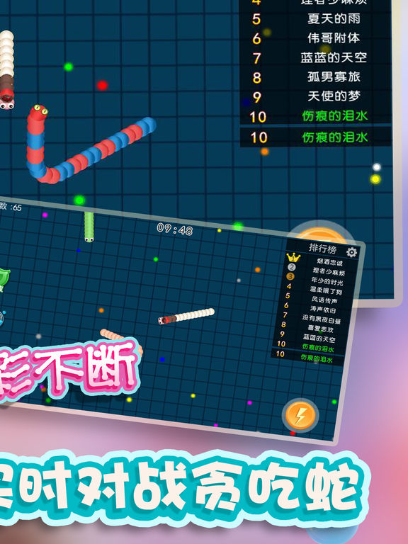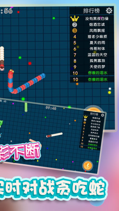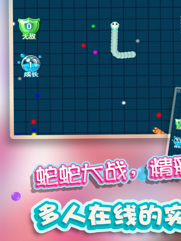 《贪吃蛇2017》 全新上线,真人联机对战更刺激! 真人对战,新一代电竞手游,大神带队妹砸多多! 组团开黑,超痛快激情团战,随时三杀暴走超神! 贪吃蛇疯狂大作战,这是一个戒不掉的游戏! 小时候玩的经典游戏,华丽变身大作战,全新玩法等你来挑战! 这是一款超好玩的休闲竞技游戏,不仅比拼手速,更考验你的策略!在贪吃蛇疯狂大作战的世界中,每个人在初始都化身一条小蛇,通过不断努力变得越来越长,最终雄霸天下! 游戏玩法 1.控制摇杆走位你的小蛇,吃掉地图上的彩色小圆点,就会变长。 2.小心!蛇头碰到其他贪吃蛇就会死亡,并且产生大量的小圆点。 3.长按加速键,用巧妙的走位让蛇身被别人撞上,就可以吃掉尸体快速变长。 4.无尽模式or限时模式,和小伙伴们比比谁更长吧! 游戏特色 以小博大,战局随时都会逆袭 简单有趣,老少皆宜的全民游戏 超Q画风,根本停不下来