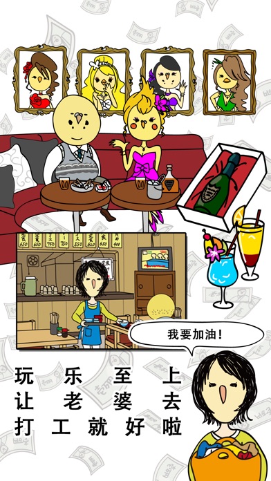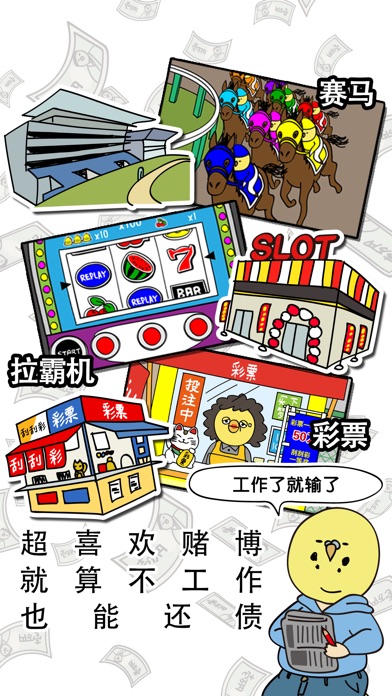 工作就输了,可是还想玩。 没钱花去借就行了。 赌赢之后再还钱就好。 明明负着债,却超喜欢赌博,超喜欢陪酒妹,可是无论如何都不愿去工作。 如果真的没钱了,还能让老婆去打工挣钱。 无论如何也不想工作的男人,玩玩闹闹就把欠债还清的游戏。 每过七天“讨债鸟人”就会上门要求偿还一部分债务。 在还债日之前通过赌博准备好这部分现金吧。 如果还不上的话....。 赌博渠道有赛马,拉霸和彩票。 但是有一些不一样的地方。 赌博赢了的时候,就去夜店找陪酒妹尽兴吧! 对送她们礼物,还有可能会获得对赌博有利的道具喔。 为了这样一个不肯工作的烂人,老婆却是辛勤地打工。 打工收入都要用来赌博呢。 是通过赌博,咸鱼翻身 还是越赌越输,走入地狱....。 就是这样的一个男人的人生游戏。