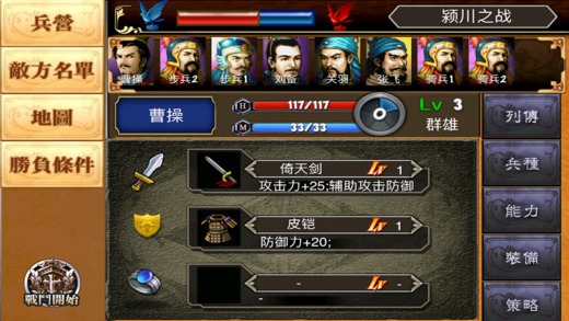 *****************免费、无内购、良心策略游戏***************** 【游戏特色】 1.三国迷独立制作,无广告、无内购、全免费、完美复刻。 2.全自由开放策略手游,再创SLG新时代。 3.挑战策略,挑战智力,越玩越开心。 【游戏简介】 该作以公元2~3世纪中国的魏、蜀、吴三国时代为背景,展开战场地图,玩家需要在一个接一个出现的战场上达成规定的胜利条件。《曹操传》前半部分较忠于历史,比如镇压黄巾军、群雄讨伐董卓、灭吕布、剿袁术、战官渡、鏖兵赤壁、争夺汉中等。后半部则可根据玩家在游戏中所选择的选项,改变曹操的结局。游戏中有两条不同的路线:一是按历史正统路线,等到刘备兵败后乘虚而进军蜀吴,最终统一全国;另一个是幻想神话路线,孔明受魔王控制,暗算刘备、联东吴战曹操,最后曹操获胜,统一全国。在神话结局中,玩家可以得到名震三国的猛将——关羽。其实再进行严格区分的话,在正统结局中还能再区分出“统一——称帝”和“统一——不称帝”两种。在游戏中,曹操的活动涵盖了汉末和三国初建时期。所有的着名人物都将登场:董卓、袁绍、袁术、吕布、刘备三兄弟、诸葛亮、赵云、孙坚、孙策、孙权等在曹操称霸全国的道路上与之一决雌雄的人物。而曹操手下也是人才济济:夏侯惇、夏侯渊兄弟、荀彧、荀攸叔侄、司马懿、郭嘉、许褚、典韦等。