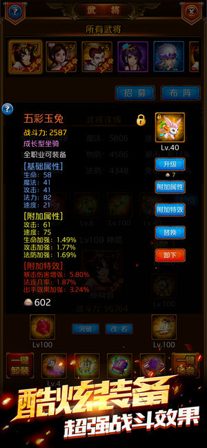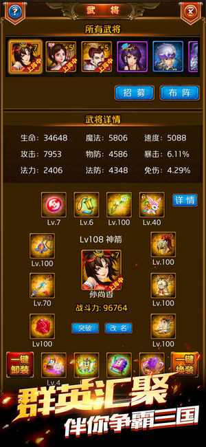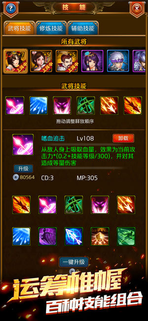 ===酷炫装备,超强战斗效果=== 浴血护符:生命值降低时,大幅提升攻击力 法连法球:每次使用技能时一定几率法术连击一次 吸血法球:对敌人造成伤害时吸取一定血量 孙子兵法:增加幸运值,提升装备爆率 太平要术:每场战斗可以使武将重生一次,打BOSS必备 鬼谷子:攻击敌人时有一定概率使敌人眩晕 更多特色装备等你来拿! ===制造机关,采集珍宝=== 制造机关兽自动采集各类稀有资源(元宝、VIP经验、百炼精铁、修炼丹等),攒钱攒装备不费吹灰之力! ===三分天下,群雄争霸=== 天下大势分久必合,合久必分,在这乱世纷争的时代与好友青梅煮酒论英雄,携手共建一方势力是最美不过的事! ===一骑当…