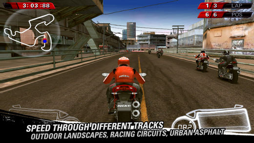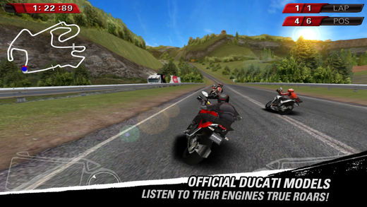 Speed and fun on two wheels, in the palm of your hand. Play Ducati Challenge up to 720p: DUCATI CHALLENGE is on your TV! Get ready for breathtaking challenges and unique thrills riding official Ducati motorbikes in a graphically stunning 3D racing game – supporting the retina display. Wheelies, stoppies, overtaking, high speed and steering precision make Ducati Challenge a must-have game for Ducati and motorbike fans alike. ---- Official Ducati bikes Ride the most powerful standard models in Ducati's line, including Monster 1100 EVO, Hypermotard 1100 EVO SP, Diavel Carbon, Multistrada 1200 S, Streetfighter S and Superbike 1198 SP. The roar of every single engine was recorded live to offer all Ducati fans an immersive experience. ---- Original and varied tracks Fast race tracks, winding mountain roads, narrow medieval village streets, bustling metropolises and hot desert valleys will make the perfect locations for breathtaking challenges, where you can safely unleash all the power of Ducati's awesome bikes. ---- Single-player Mode CHAMPIONSHIP: 3 competitions of increasing difficulty and challenges (including qualifying rounds to set the starting grid). QUICK RACE: pick your ride, track, number of laps and difficulty level and just jump into the race. More tracks and bikes will be unlocked as you progress through the championship mode. ---- Multiplayer Mode Challenge your friends in the Wi-Fi Multiplayer Mode with races for up to 4 players. ---- Different camera angles In-game camera angles convey all the thrills of high speed racing on two wheels. Opt for a standard third person view or the amazing first person view. ---- Easy handling Thanks to the customizable handling system (including steering sensitivity control based on your device leaning and the brake assist), Ducati Challenge offers user-friendly controls for players of all levels, ranging from beginners to experts. You can choose between arcade and simulation settings to get your favourite drive experience. --- Graphic Quality Thanks to the personalization of the graphic quality, it’s possible to choose between 3 differents settings to get the best performance out of your device: low quality (no effects), medium quality (antialias activated), high quality (antialis + motion blur + high quality particles activated). ---- Image galleries and achievements The rich game Extras, including unlockable achievements and exclusive Ducati images you can save on your device, will be the icing on the cake for all Ducati and motorbike fans alike. ---- iPod Library Listen to your own music playlists during in-game challenges. ---- Game Center Climb the leaderboards recording the best laps on each track. FIND US ON: www.facebook.com/DucatiChallenge www.facebook.com/DigitalTalesGaming FOLLOW US ON: www.twitter.com/Digital_Tales WATCH OUR VIDEOS: www.youtube.com/DigitalTales