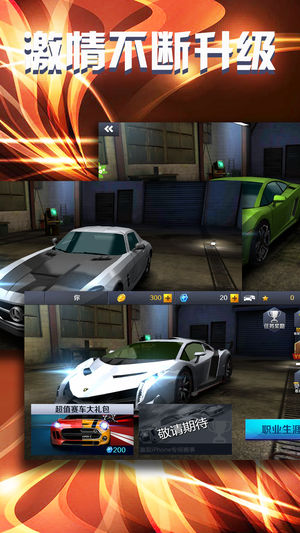 3D画质带来最佳的激情视感,带你享受更加完美的视觉感受。 游戏可以让玩家驾驶世界上最快的多种梦幻跑车,包括法拉利,兰博基尼以及柯尼塞格等,游戏设计多种不同风格的场景,包括雪地,沙漠,城市以及长城等等!多样的比赛模式包括经典赛,计时赛,淘汰赛,对决模式。 游戏中有多种操作模式和多种视角,途中有多种车辆干扰形式,需要随时变换车道,可以通过手机重力感应操控赛车方向,也可以设置成手动控制方向,让玩家在游戏中有身临其境的感觉!全新的游戏画面,舒适的操作手感,刺激的赛车竞速,完美的过弯体验!您还在犹豫什么!快来尝试吧!