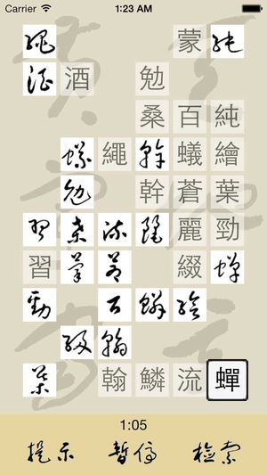 不知不觉在游戏中学习认识草书! --以标准草书字汇为准,字库1500余字 --共36关,入门阶段有提示功能 --可按部首检索某字草书