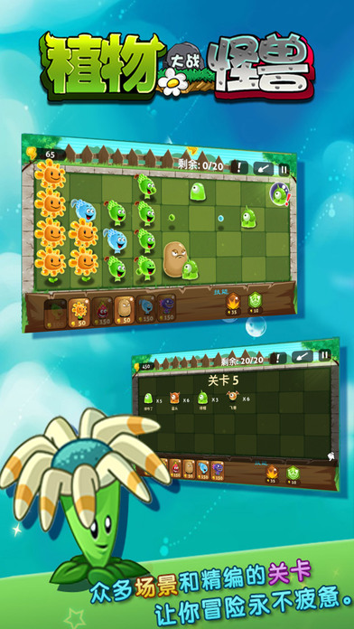 《植物大战怪兽》是史上最火爆的塔防游戏力作!植物军团再次发力,超强精英植物卫士,配备最新植物科技,陆空全方位战略性封锁战线,将所有小怪兽阻挡在入侵的道路上! 3大主题场景,多个可选关卡,张牙舞爪的小萌怪兽,超强力英雄伙伴随时支援,更有陨石雨、雷暴、万里冰封等酷炫助力,带你超神带你飞!快和向日葵大大并肩作战,抵御怪兽军团的入侵吧!